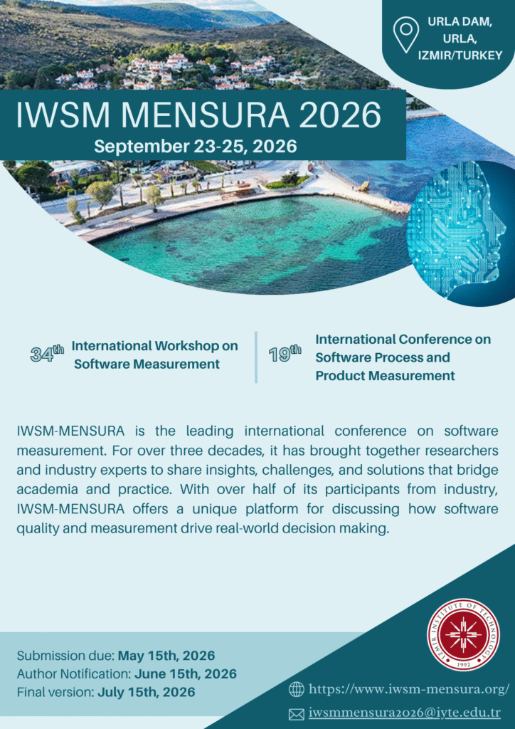 The 34th International Workshop on Software Measurement (IWSM) and the 19th International Conference on Software Process and Product Measurement (MENSURA) will be held on September 23–25, 2026, in Urla, Izmir, Turkiye.